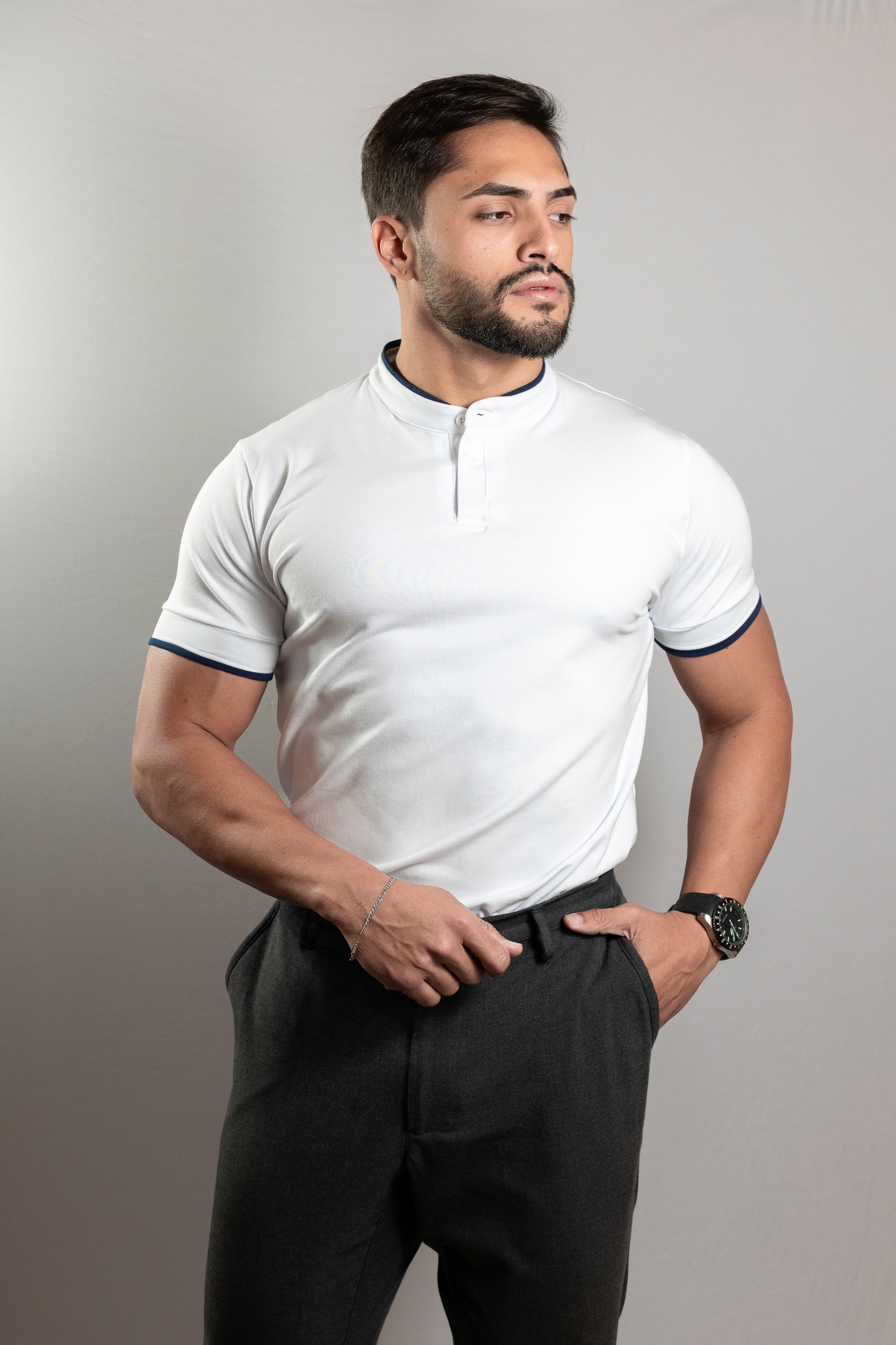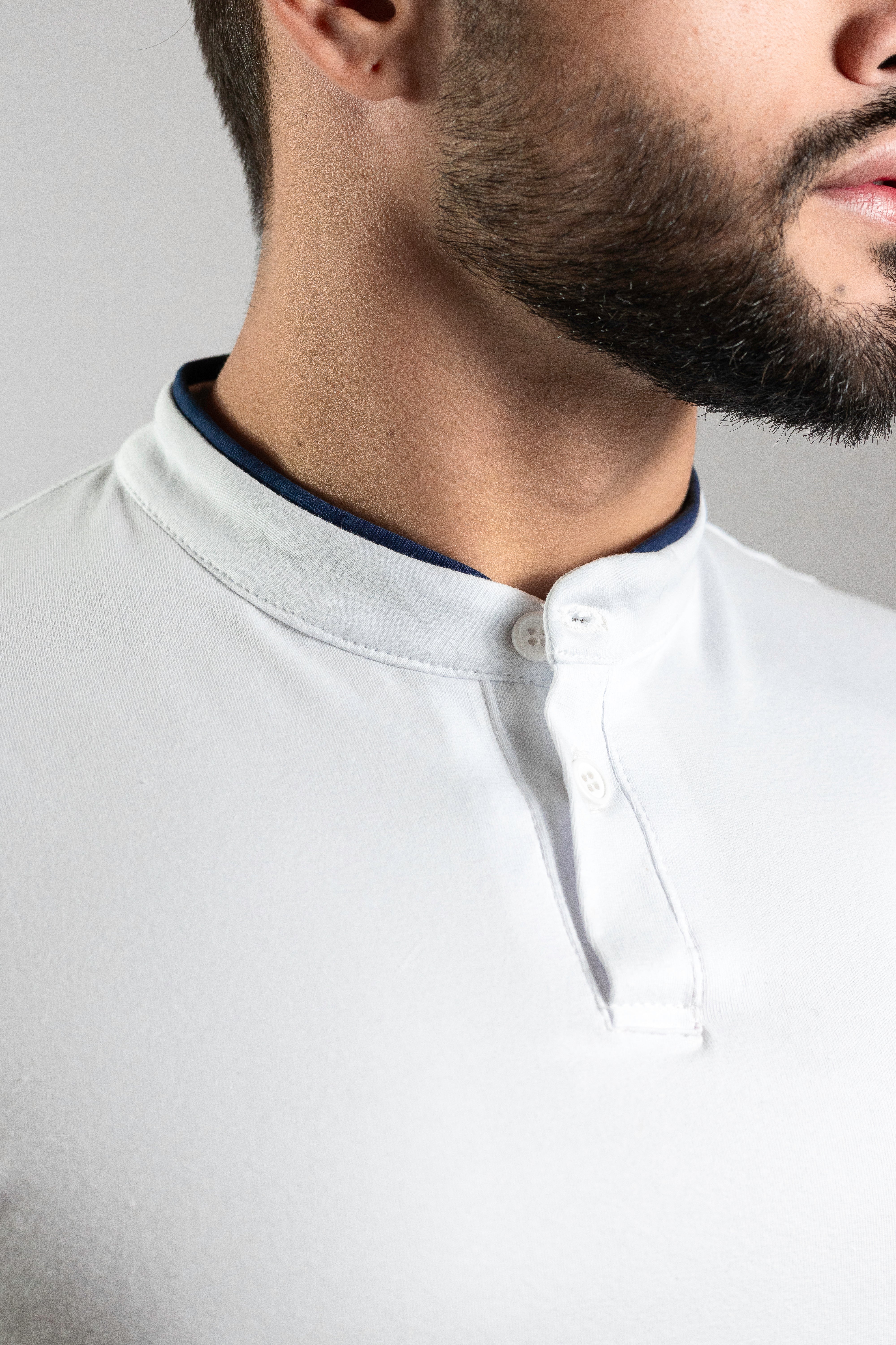 Camiseta Henley branca com detalhes em azul marinho (gola padre) - Algodão Egípcio